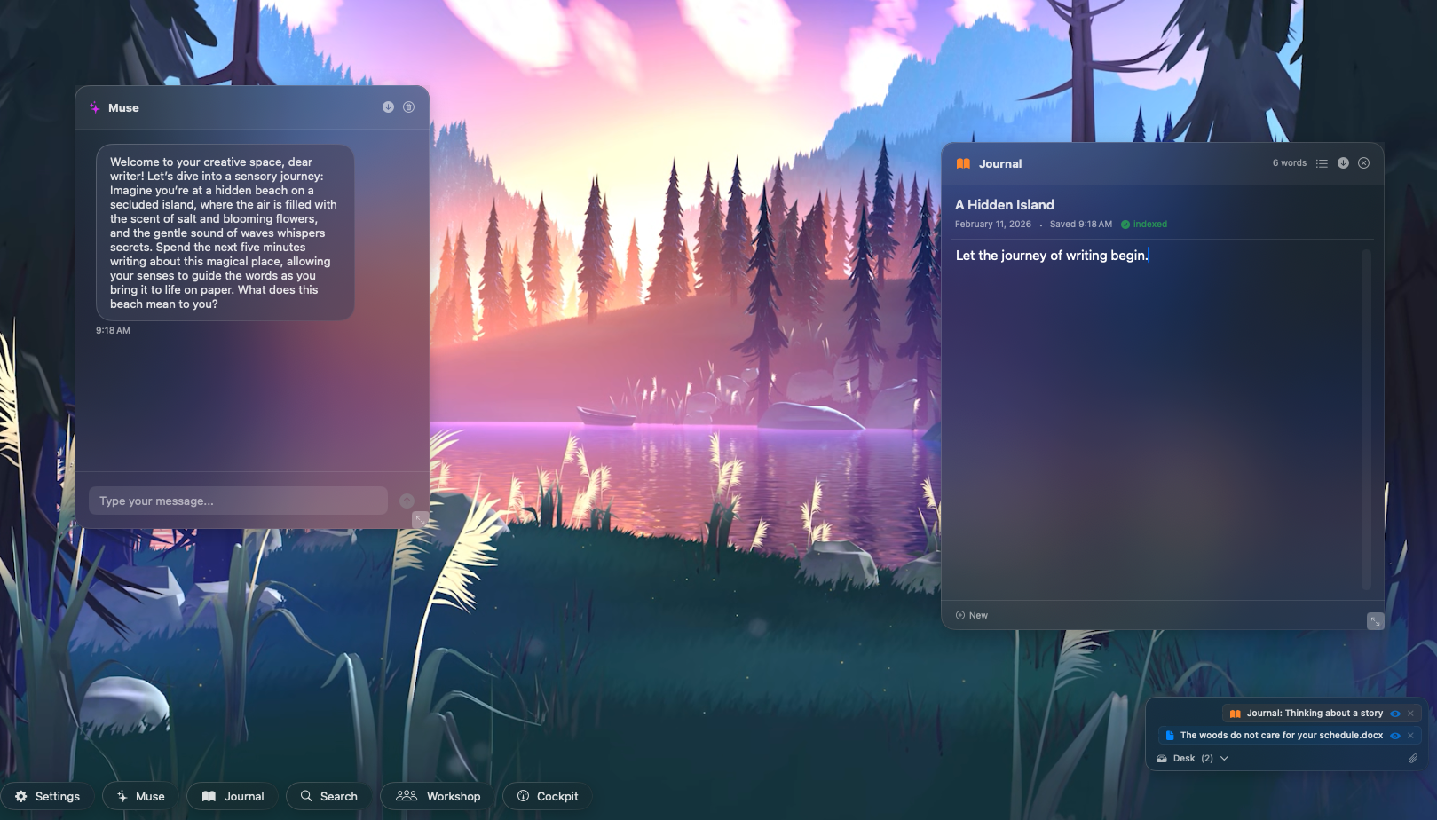 Every window floats as a translucent glass pane over cinematic backgrounds. The Muse, Workshop, and Journal all float independently, letting you arrange your creative workspace however you want.
